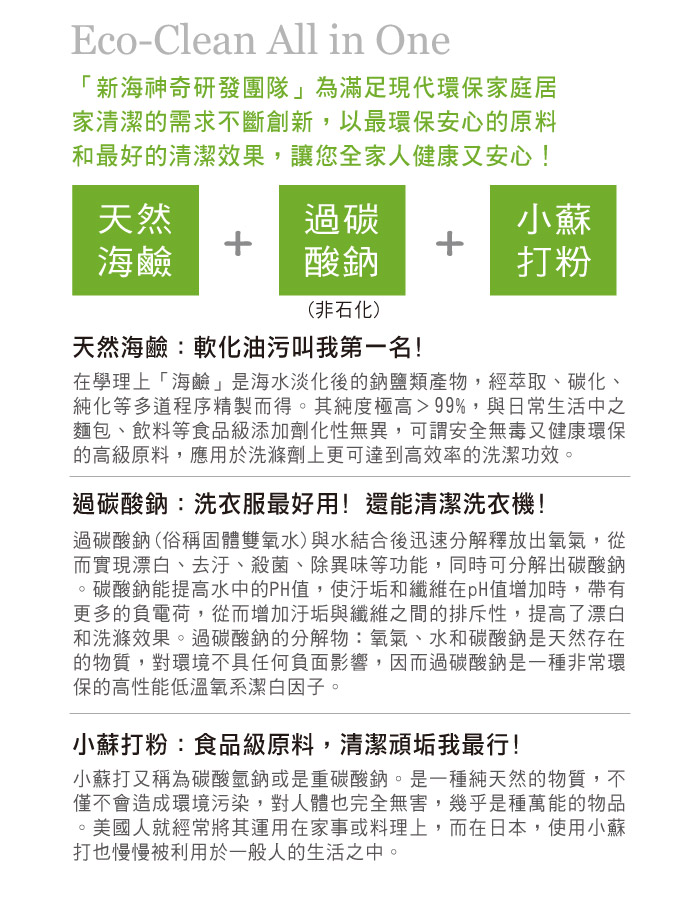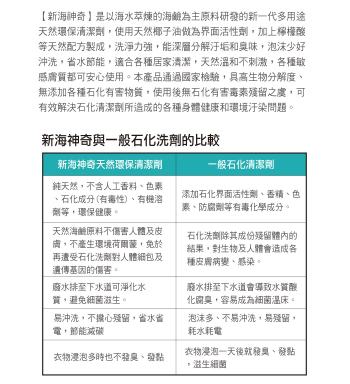 【新海神奇】是以海水萃煉的海鹼為主原料研發的新一代多用途天然環保清潔劑,使用天然椰子油做為界面活性劑,加上檸檬酸等天然配方製成,洗淨力強,能深層分解汙垢和臭味,泡沫少好沖洗,省水節能,適合各種居家清潔,天然溫和不刺激,各種敏感膚質都可安心使用。本產品通過國家檢驗,具高生物分解度、無添加各種石化有害物質,使用後無石化有害毒素殘留之虞,可有效解決石化清潔劑所造成的各種身體健康和環境汙染問題。