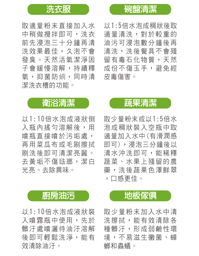 粉狀:洗衣或強力頑垢:抽油煙機、流理台、布鞋等,請用菜